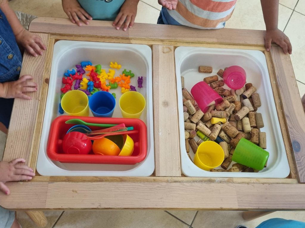 Els tallers d’experimentació ofereixen als infants l’oportunitat de tocar, manipular i descobrir objectes de l’entorn natural o quotidià. Aquests materials, com pedres, fulles, aigua o fins i tot estris de cuina, proporcionen una riquesa sensorial que els permet conèixer diferents textures, formes i colors, desenvolupant així els seus sentits i la seva comprensió del món. A través de la manipulació i l’experimentació, es fomenta la curiositat i l’aprenentatge autònom.
